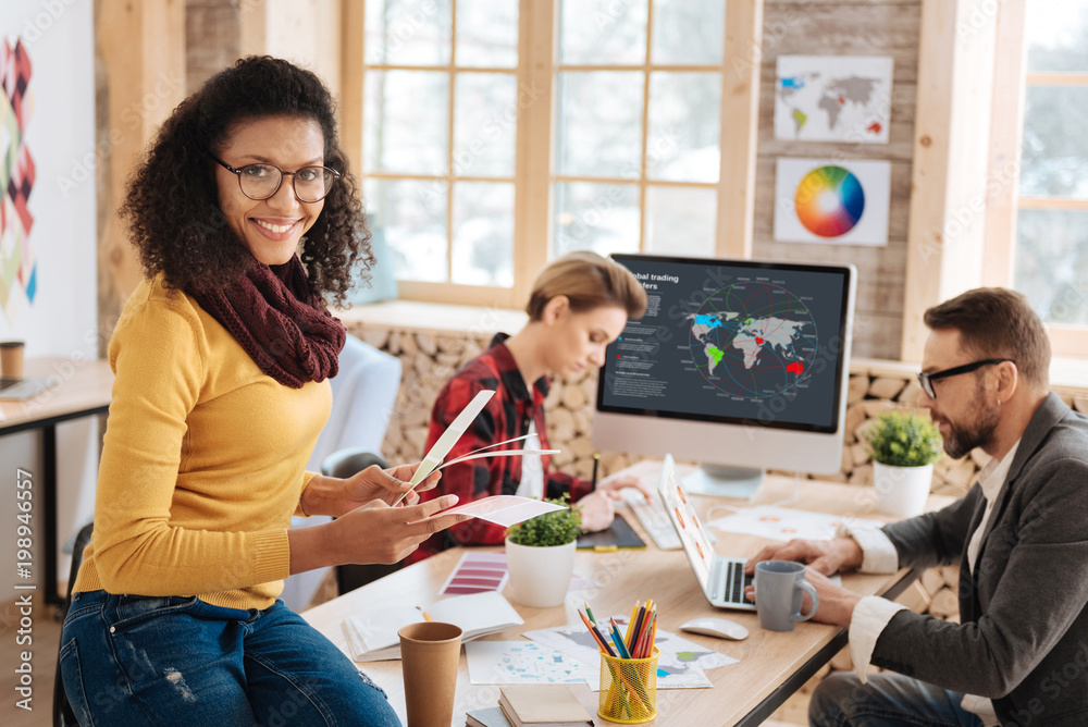 My good day. Good-looking joyful curly-haired woman smiling and sitting on the table and her colleagues working in the background