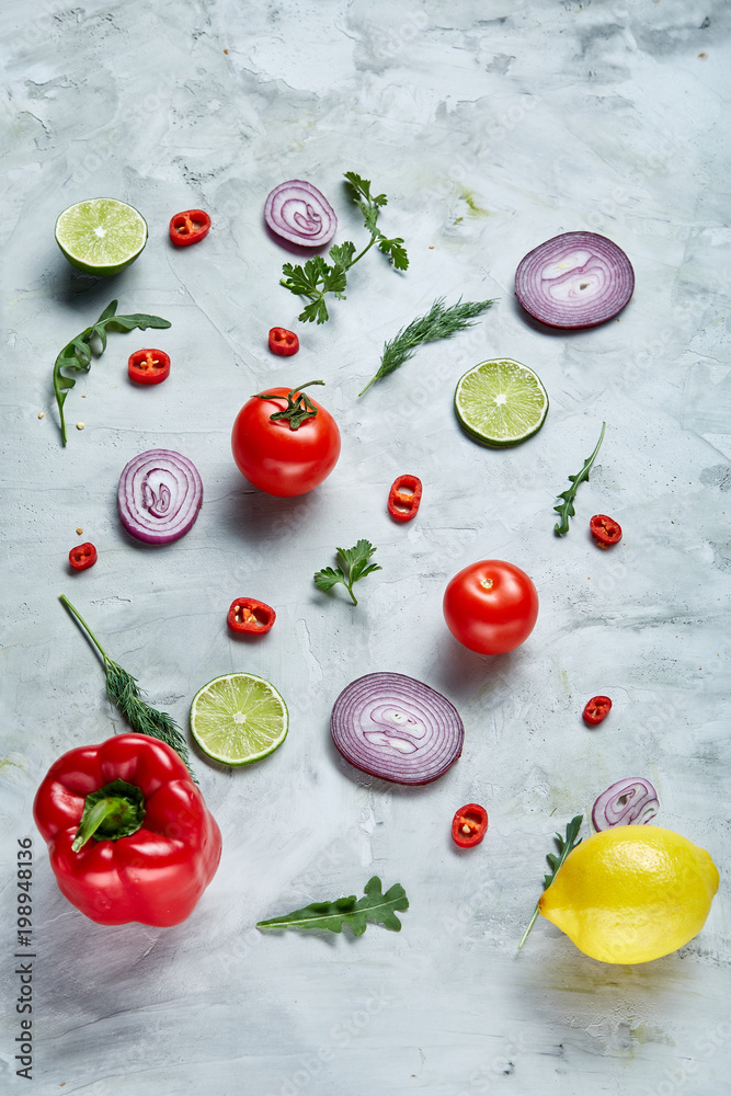 Chopped onion, red hot pepper and spice isolated on white background, top view, close-up, selective focus