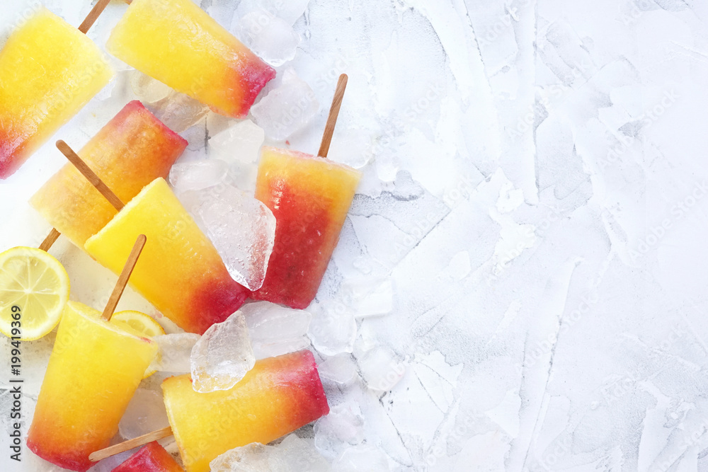 Sweet refreshing summer food concept. Ice cream fruit ice yellow orange and red colors and slices of lemon top view on a white marble table, copy space. Summer wallpaper.