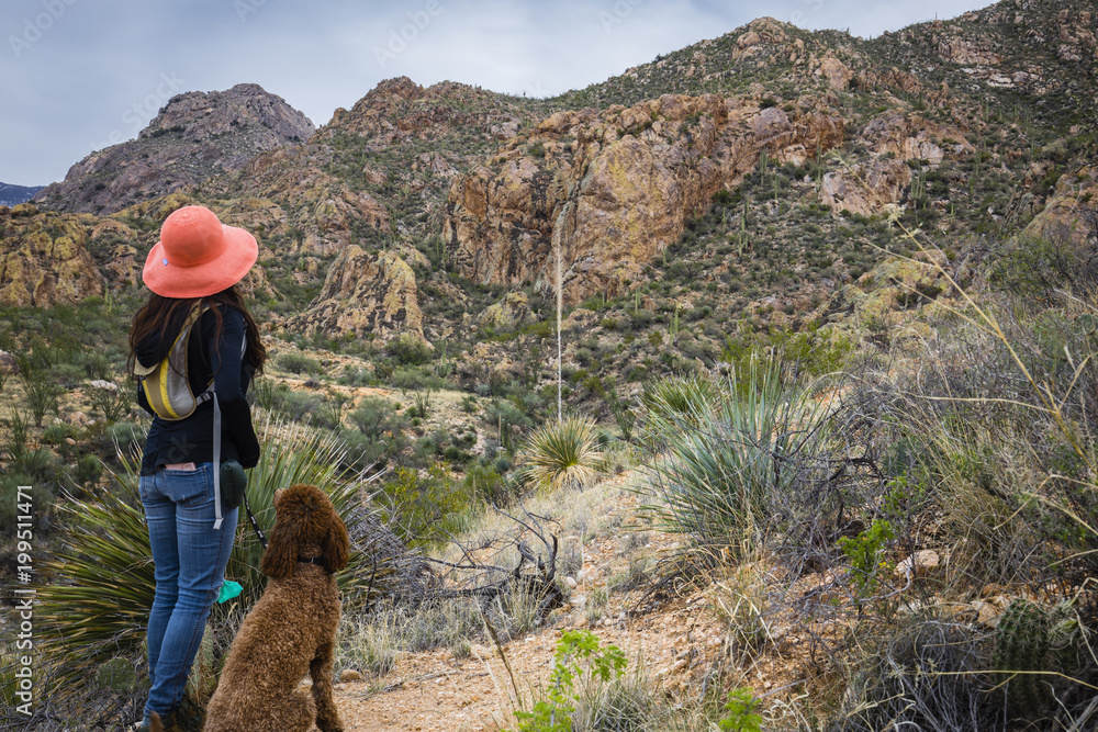 Hispanic woman hiking on a mountain trail near Tucson, Arizona.