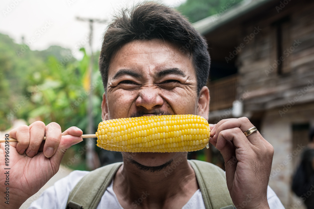 Man tourists with backpacks happily eat ripe corn traveling in Asia