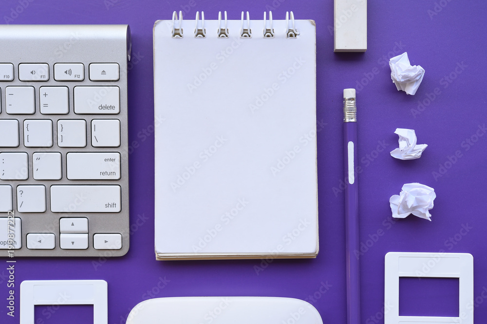 Top view of office desk table with keyboard, notebook, pencil and mouse for background