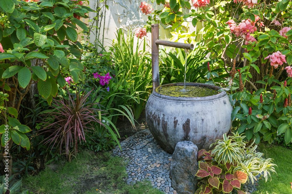 Gartengestaltung. Schöne Gartenbrunnen in einem Paradiesgarten.