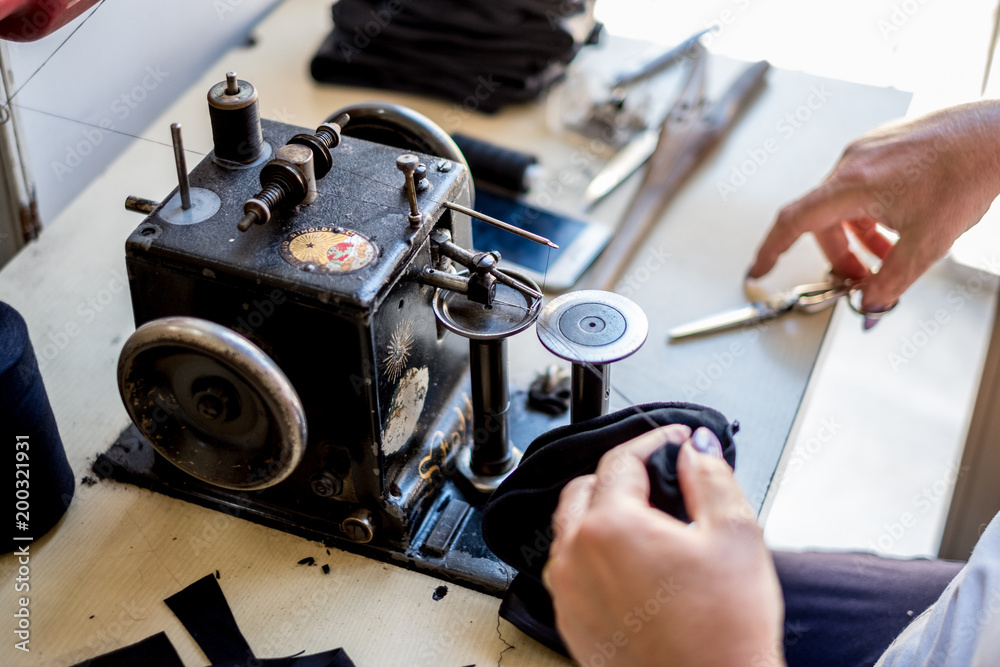 Mani di una sarta italiana che lavorano fili su una antica macchina per il cucito