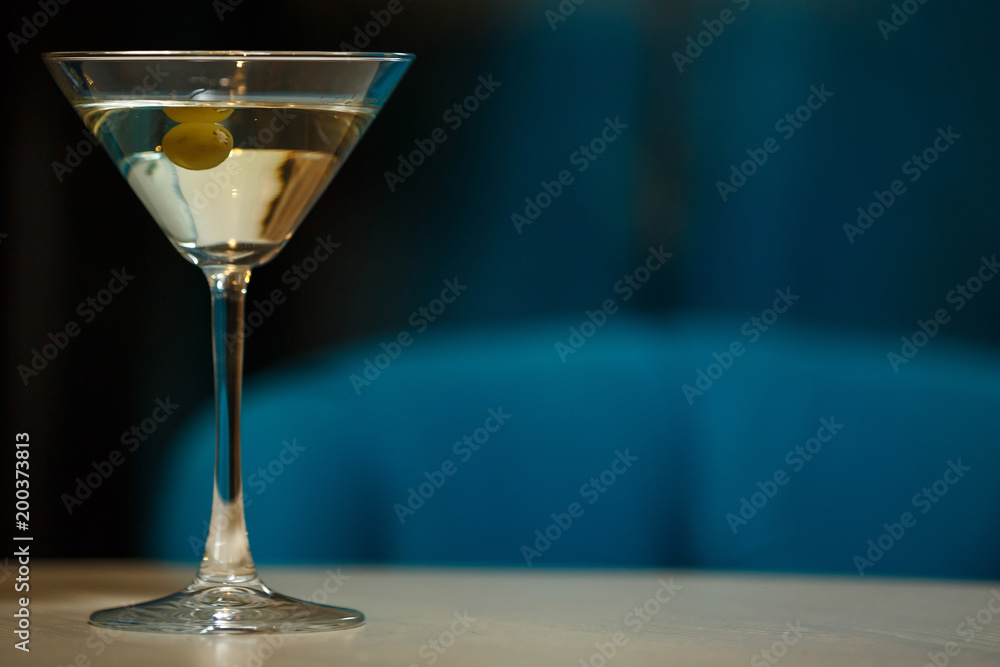glass with martini , focus on a olives