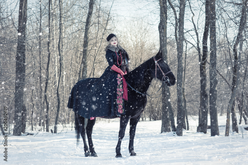A girl in a long black dress with a dark horse