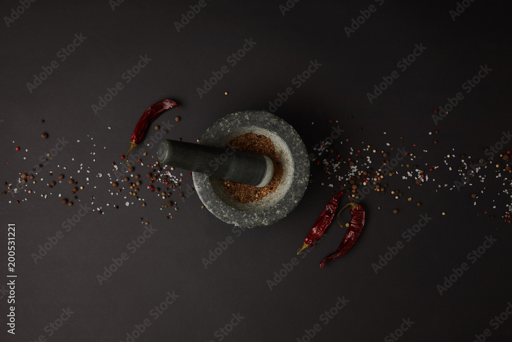 flat lay with mortar, pestle, spices and chili peppers on black tabletop