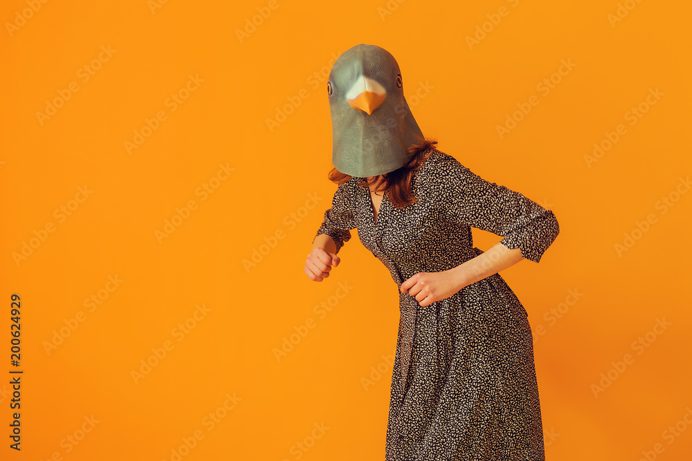 Woman funny portrait wearing pigeon mask and doing chicken imitation