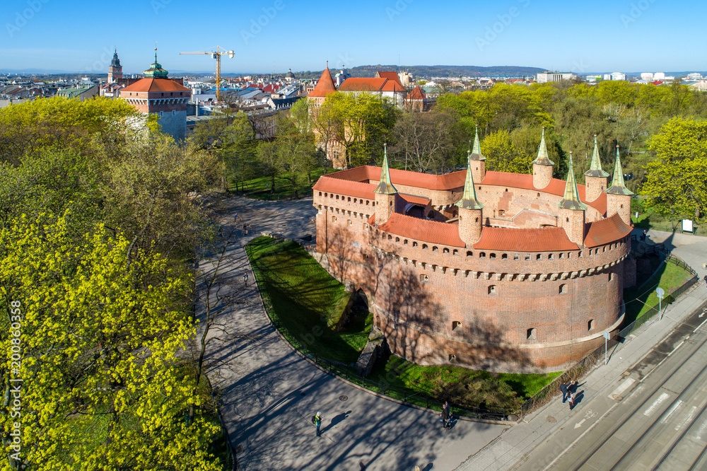 Barbican (Barbakan) in Cracow, Poland. The best preserved medieval barbican in Europe and Planty park surrounding the old city. Aerial view