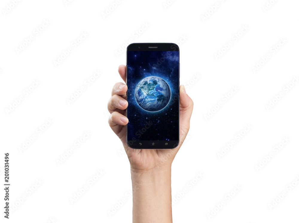 hand holding mobile phone or smart phone on Planet Earth background. Life style, Technology, communication, connection, Environment, Climate issues and Saving the planet concept