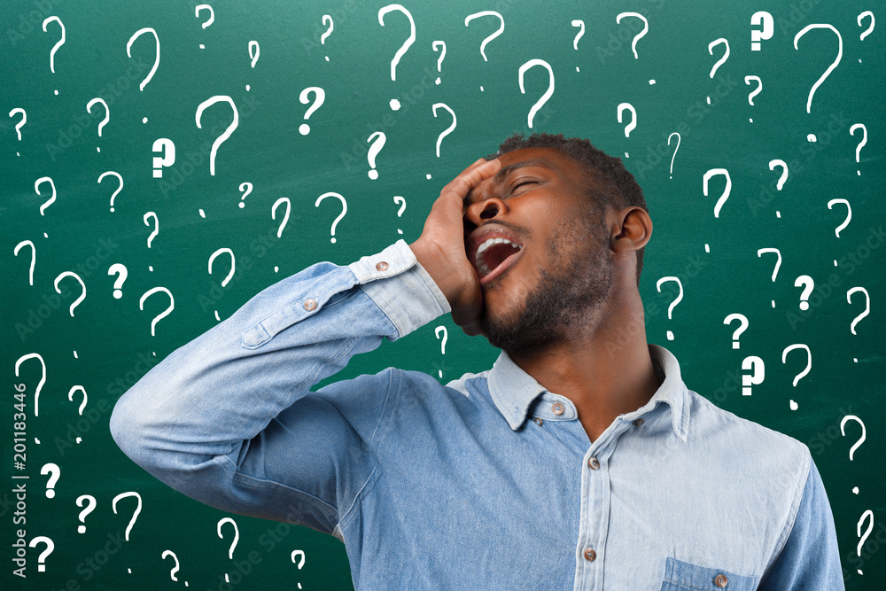 Puzzled thoughtful african american man, student, businessman solving his problem