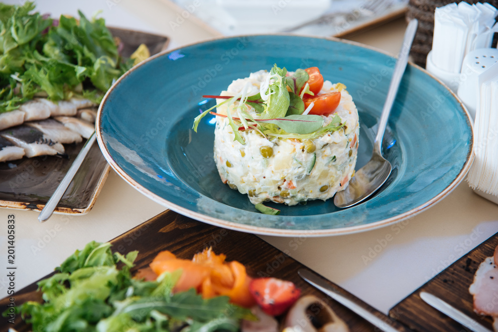 Russian traditional salad Olivier on blue plate
