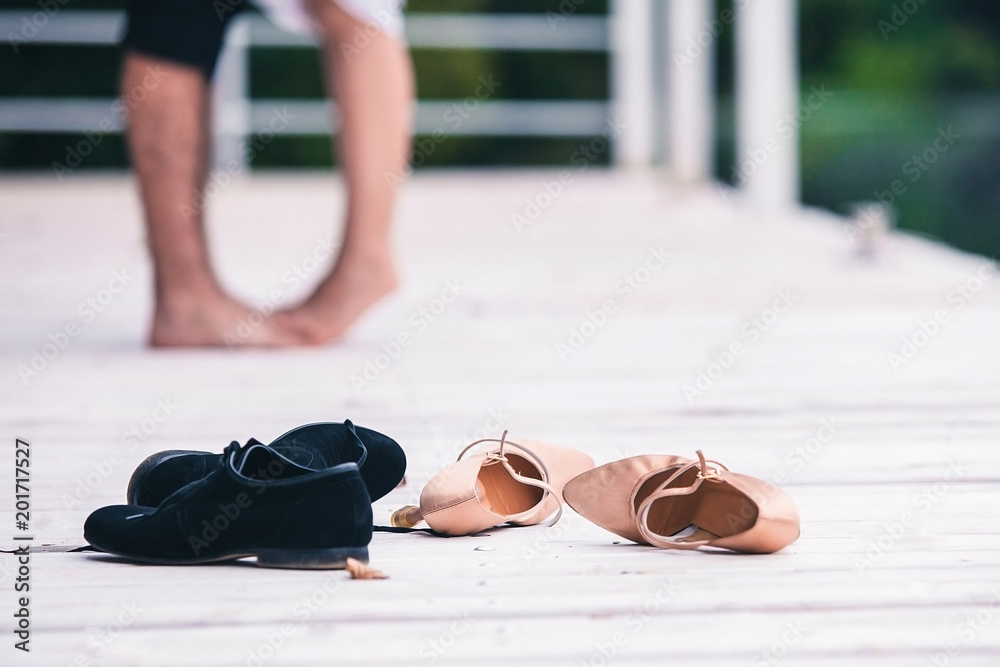 shoes for woman and man stand on the floor in the room on the background of a couple