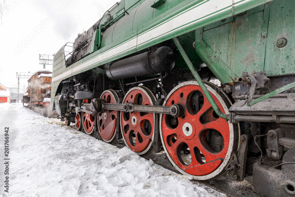 red wheel and detail of mechanism a vintage russian steam train locomotive
