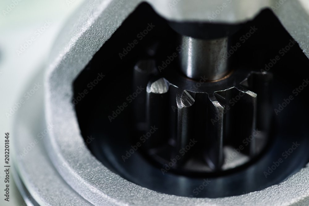 Background image of auto parts with rotor close-up. Big black pinion in metal part. Gear parts inside.