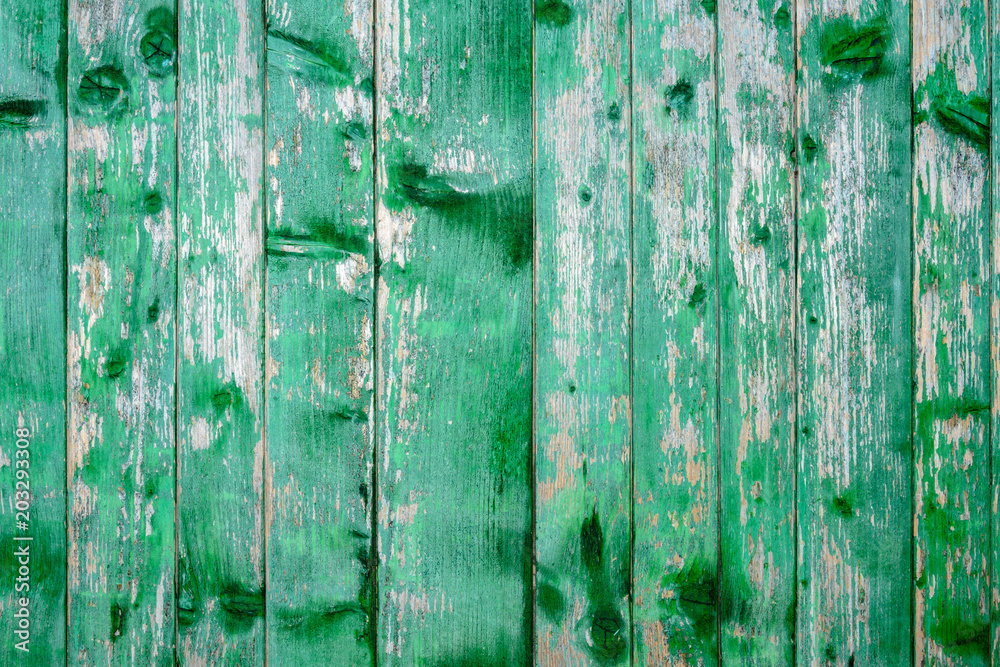 Amazingly beautiful old texture of a green wooden wall with cracked paint