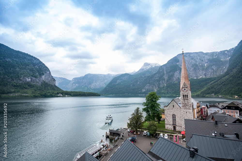 church against lake in hallstatt, austria