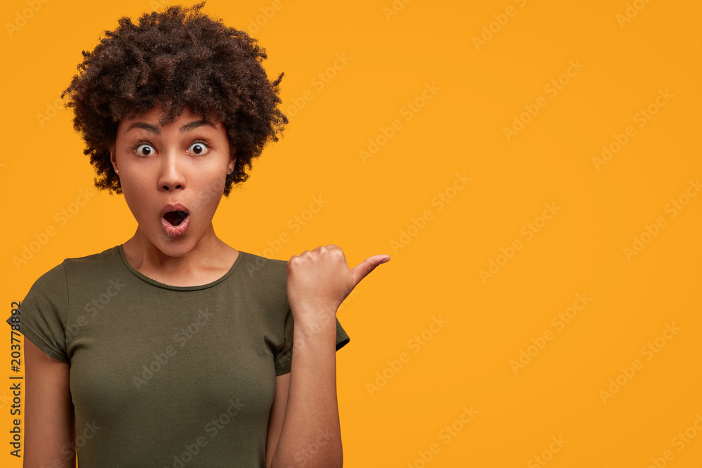 Photo of greatly surprised dark skinned female with bushy Afro haircut, wears casual t shirt, indicates at yellow blank copy space, keeps mouth widely opened, being astonished with something.
