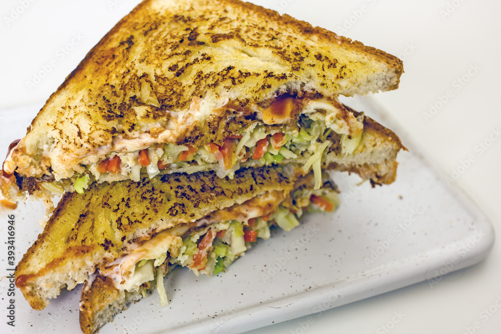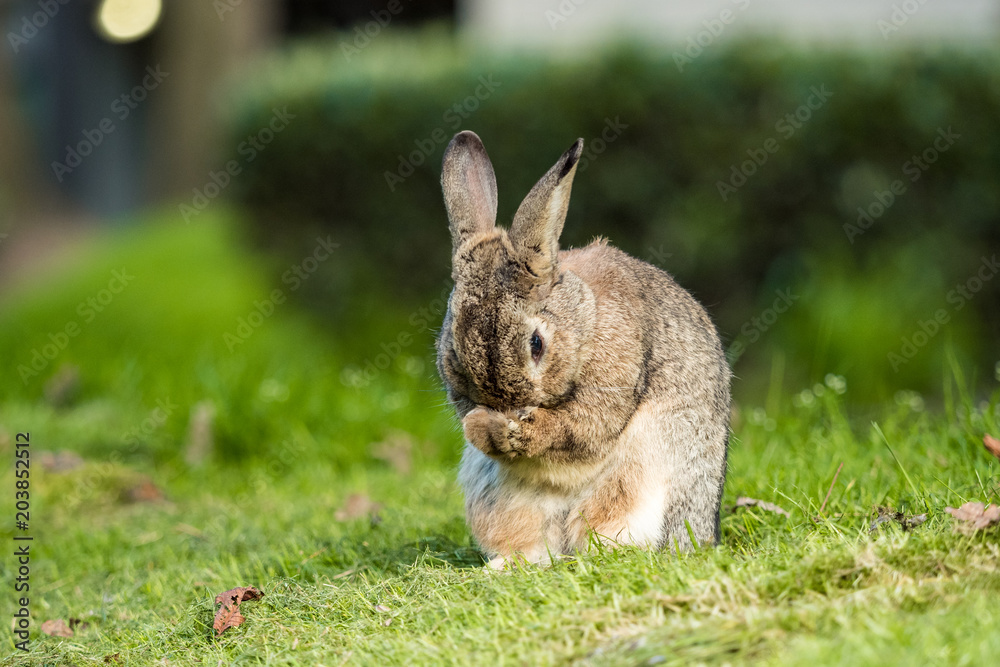 cute brown rabbit washing its face with its front paw under the sun on the grass