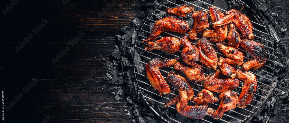 chicken wings of barbecue in honey sauce with lime slices. the dish is made and served in a rustic style