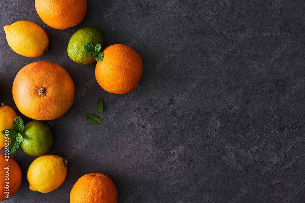 Top view of fresh ripe citruses. Lemons, limes, oranges and grapefruits on dark concrete background. Flat lay with copy space on the right.