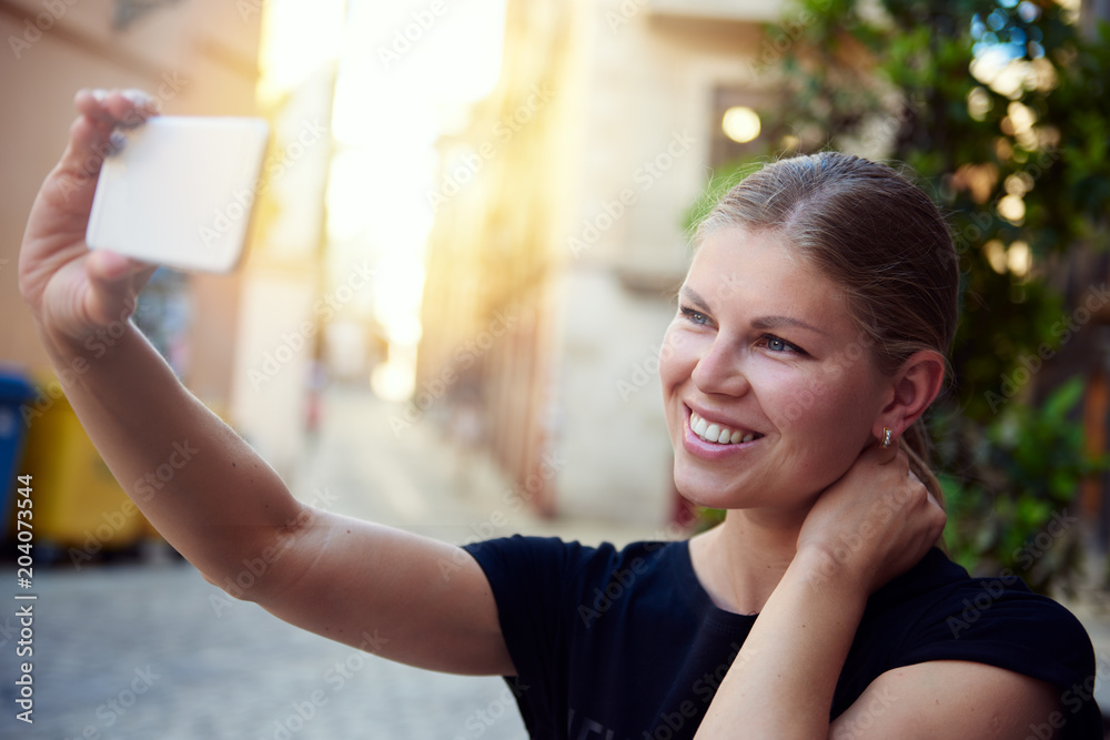 Pretty smiling female taking selfie with smartphone on the street. Concept of travel and lifestyle.