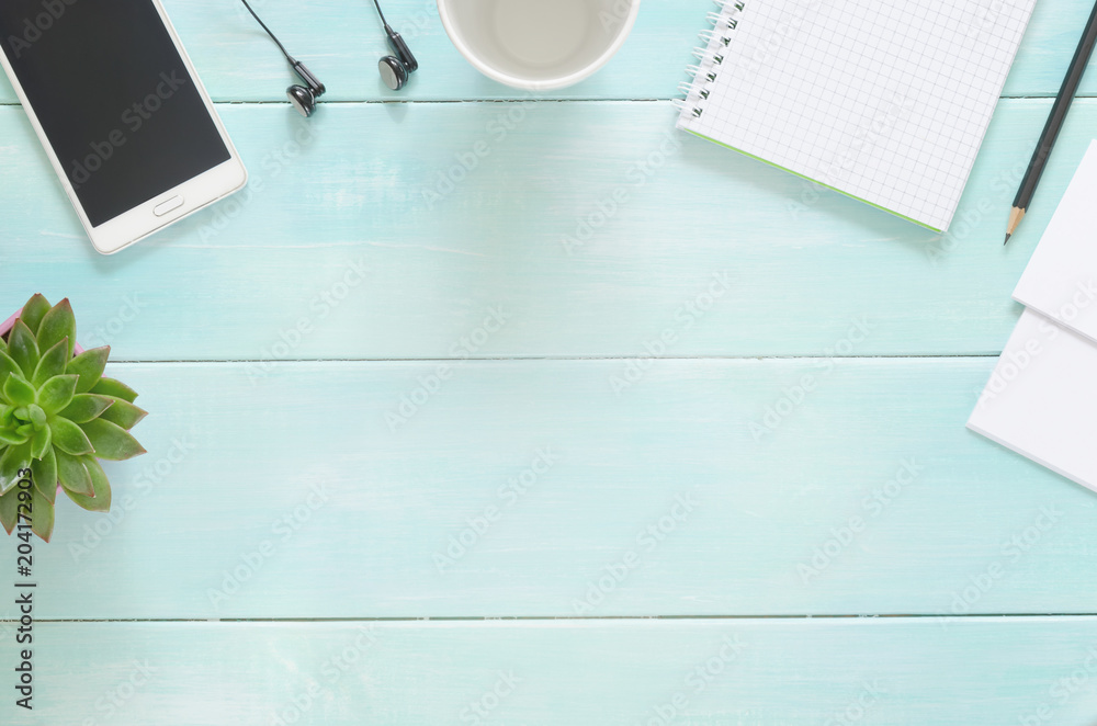 Desk with pencil, paper, cup, phone, headphones, notebook and succulent