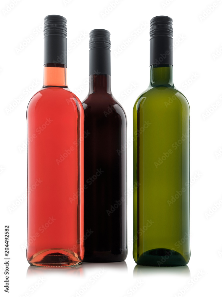 Group of blank wine bottles with white red and rose wines isolated on white background for individual designs and graphics