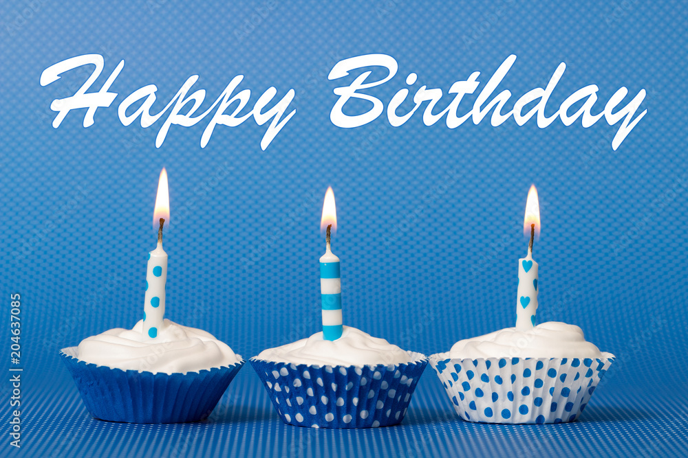 three blue birthday cupcakes