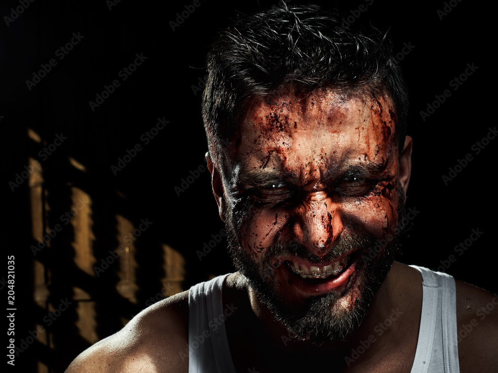 A strong, a serious, muscular man in a white t-shirt is worth and looks in camera. He's got the beard on the face and different emotions