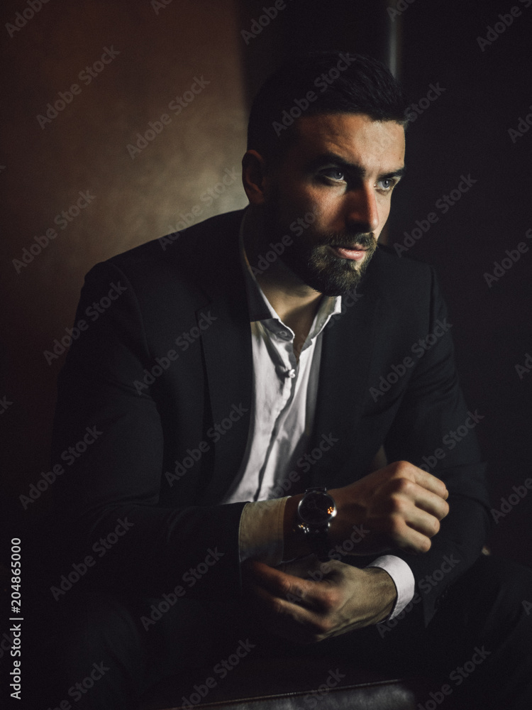 A handsome man with a beard and in a classic suit sits in a leather chair and looks at the camera.