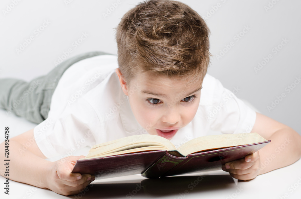 Ein Kind liest liegend ein Buch und wirkt überrascht und begeistert