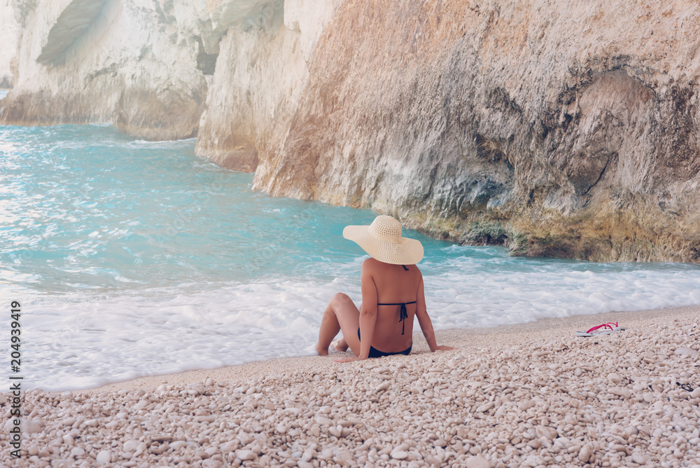 Young beautiful woman in swimsuit and hat relaxing on Navagio beach, Zakynthos island, Greece