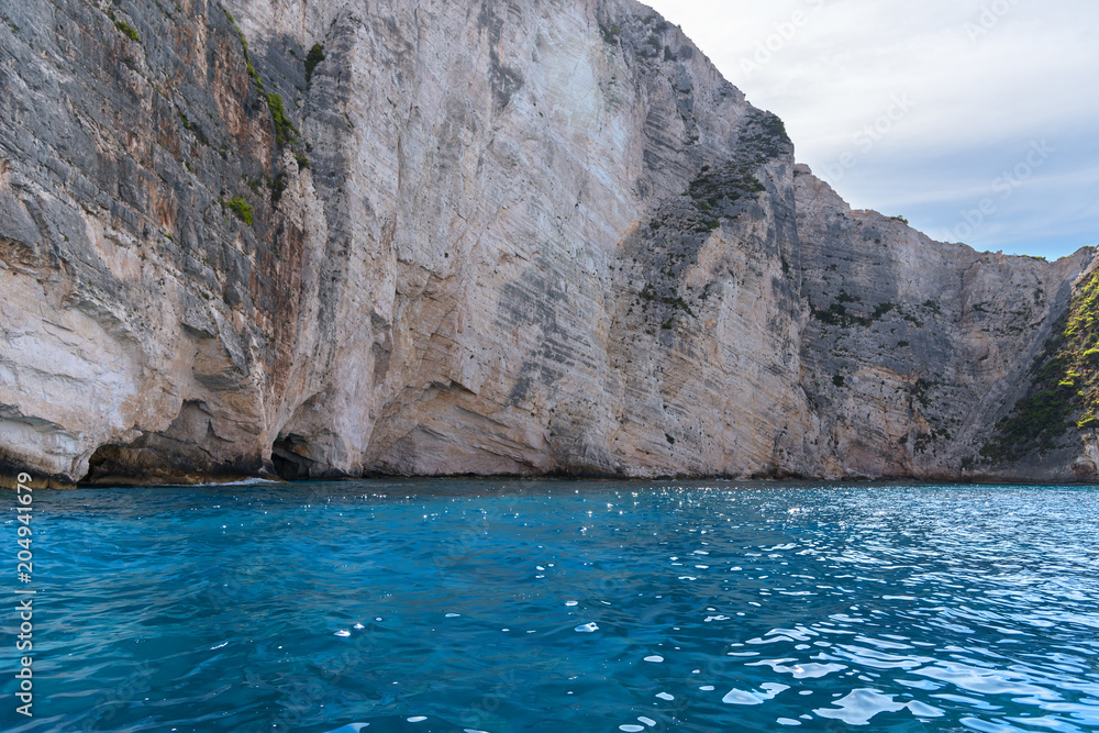Blue Caves and blue water of Ionian sea on Island Zakynthos in Greece and sightseeing points. Rocks in clear blue sea