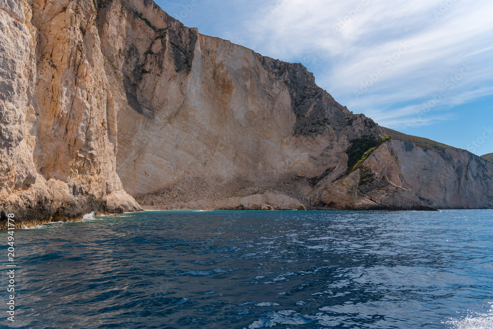 Blue Caves and blue water of Ionian sea on Island Zakynthos in Greece and sightseeing points. Rocks in clear blue sea