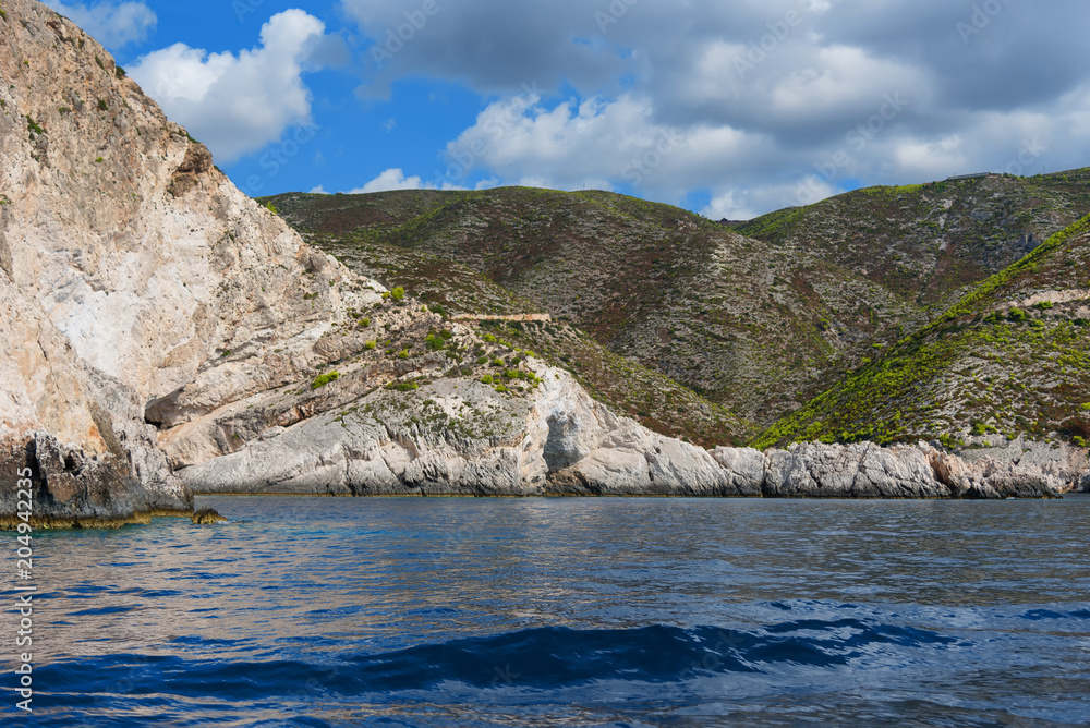 Blue Caves and blue water of Ionian sea on Island Zakynthos in Greece and sightseeing points. Rocks in clear blue sea