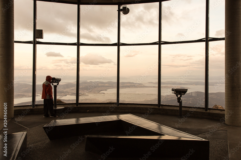 Tourist views Hobart from Mount Wellington