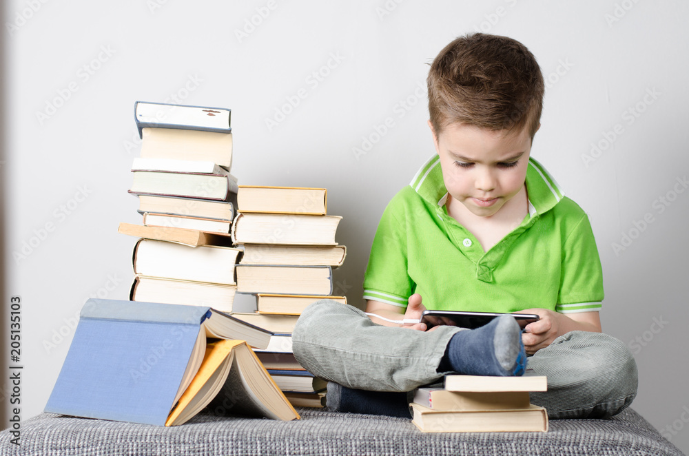 Kind sitzt auf der Sofa und spielt mit dem Smartphone neben Stapel Bücher
