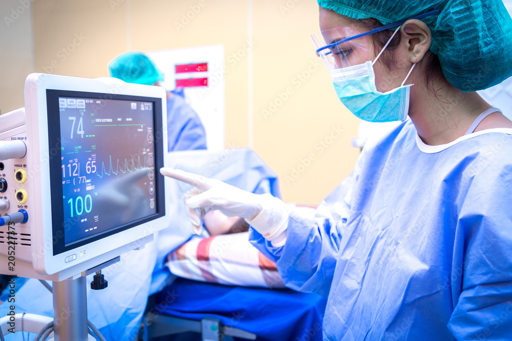 Female surgeon using monitor in operating room.