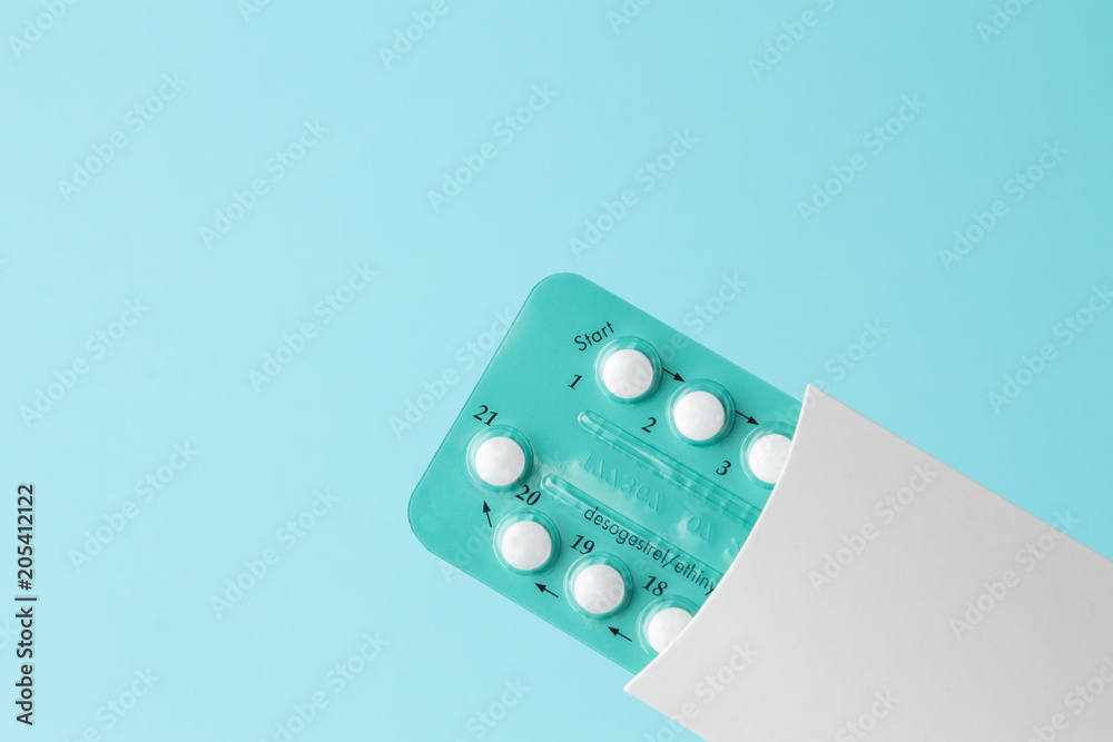 Pack of oral contraceptive pills with instructions. Blister in white case on blue background