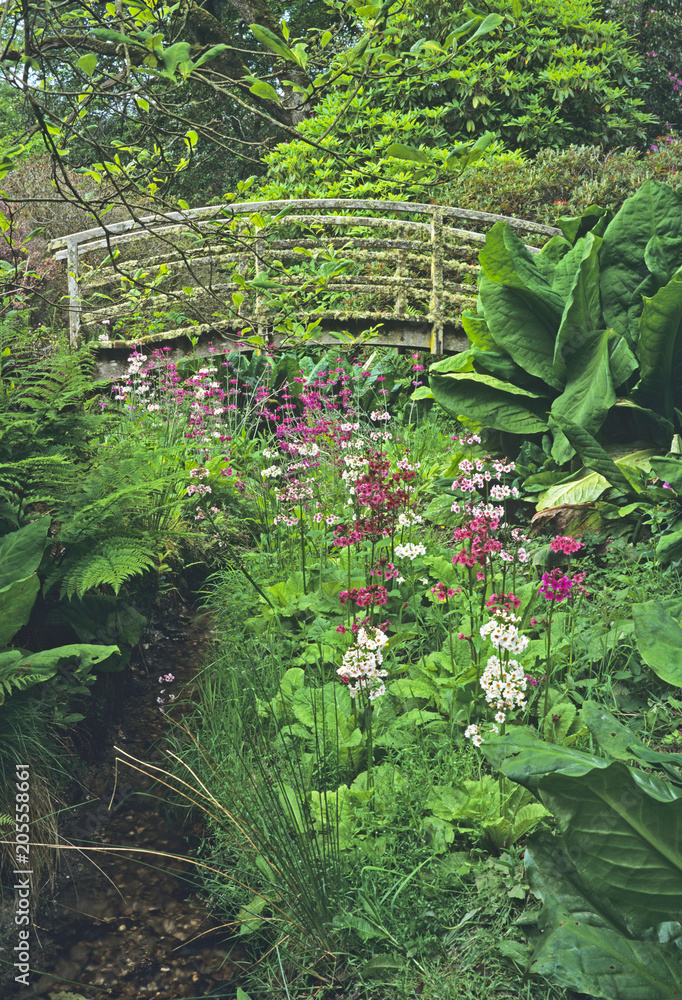 A wooden lichen covered memorial bridge in the Japanese style in a cornish garden