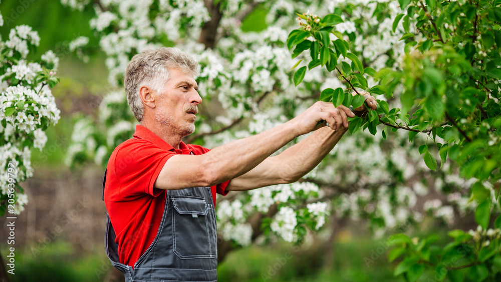 gardener with pruner pruning apple tree branch at summer garden background. people and farm concept