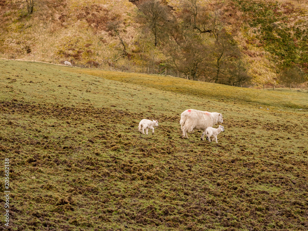 Mother and baby lambs on moorland around Darwen, Lancashire, UK