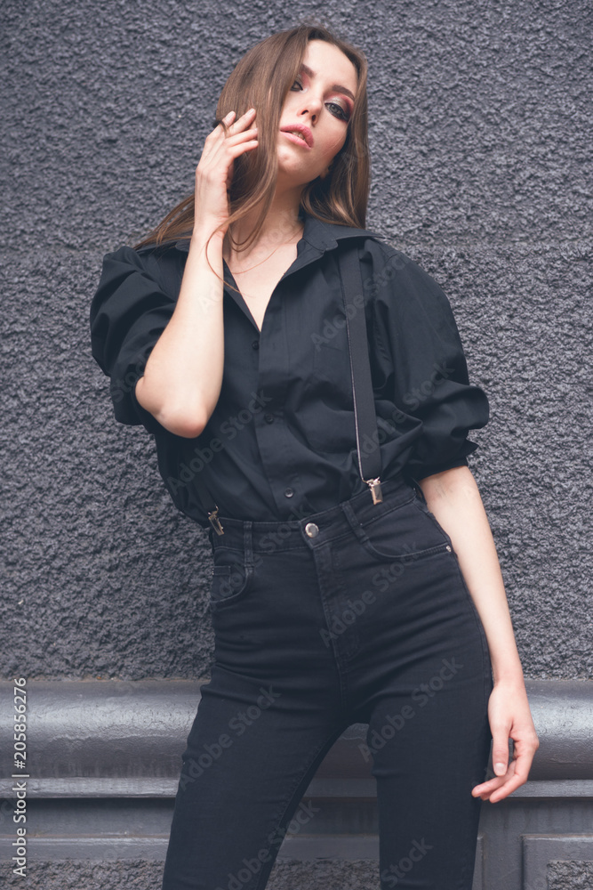 Beautiful girl in black clothes oversize with suspenders. Dark background. Toned image.