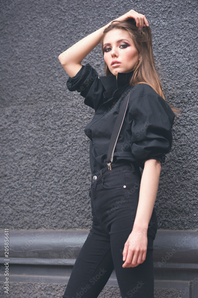 Beautiful girl in black clothes oversize with suspenders. Dark background. Toned image.