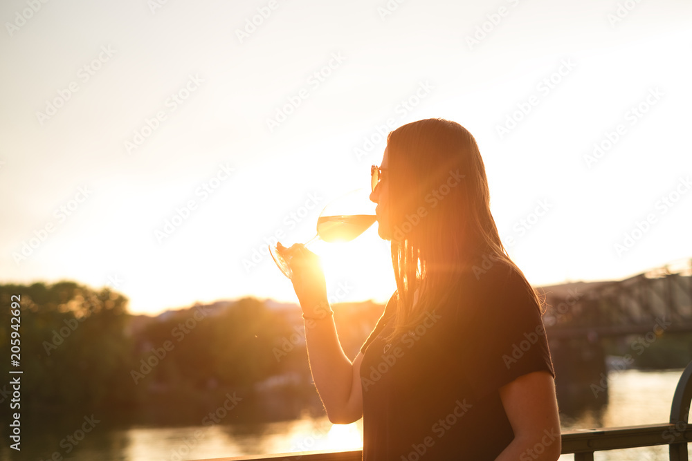 Woman drinking a wine in the city during a sunset. Glass of red wine. Concept of free time in the city and drinking alcohol.