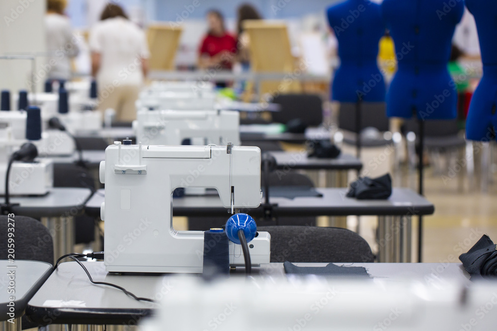 nterior of garment factory shop. Closes making atelier with several sewing machines. Tailoring industry.