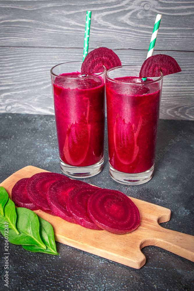 Healthy purple smoothie of beet on gray background