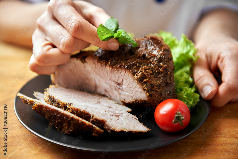 Woman decorating beef steak in restaurant kitchen.