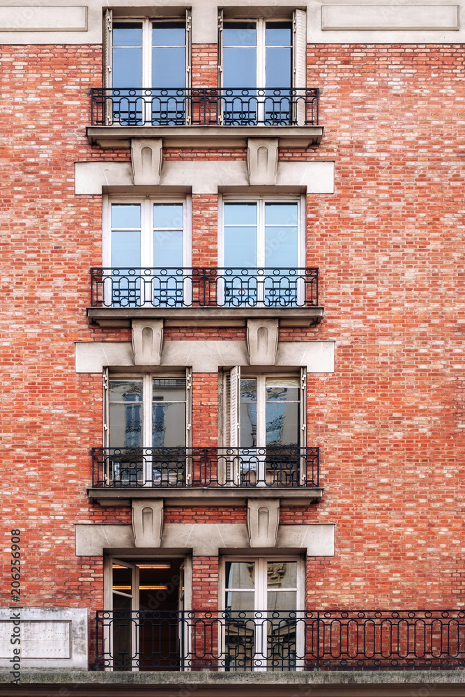 Four pairs of windows with balconies from an openwork iron grating against a wall of red brick in the city of Paris.